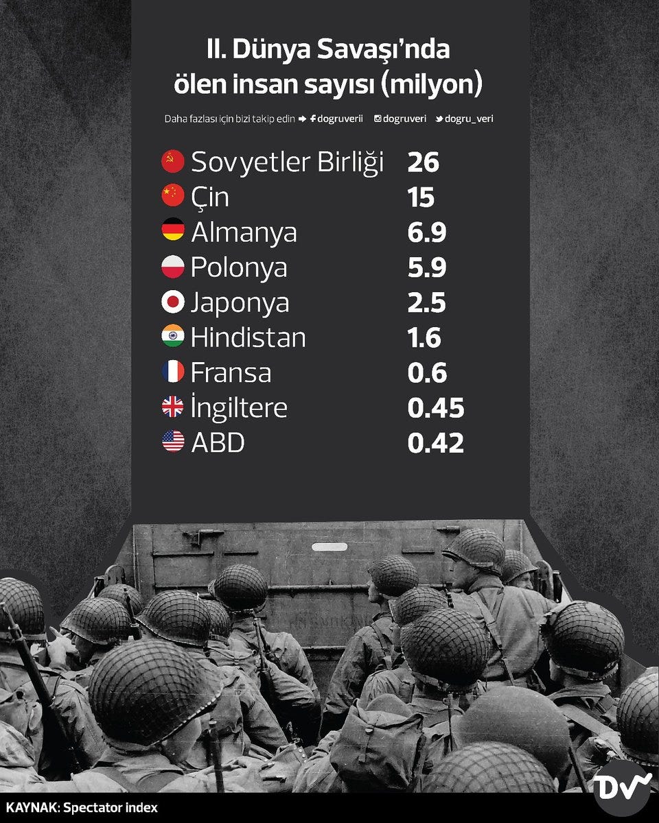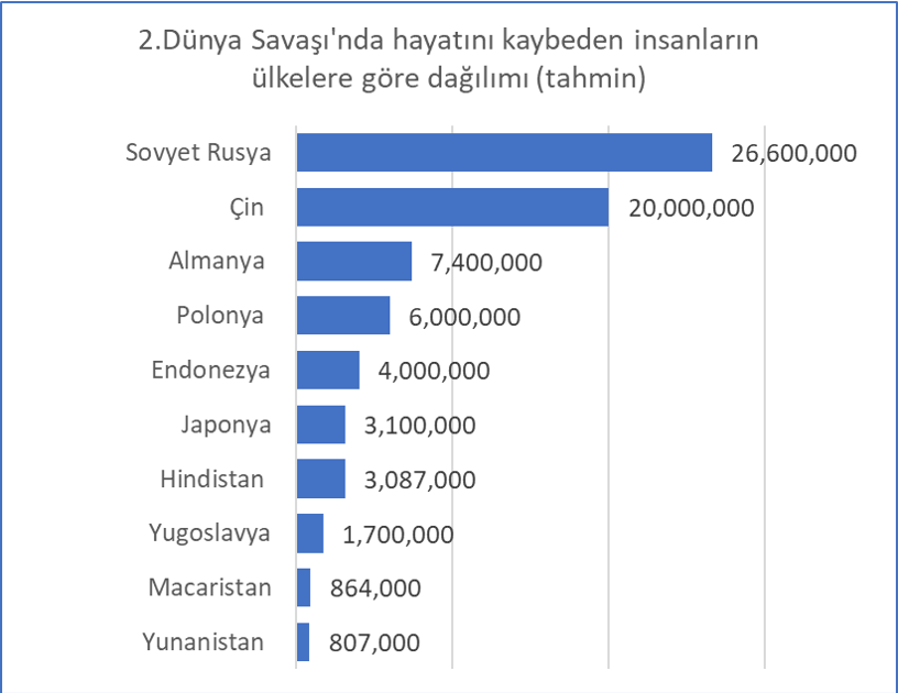 Dünya Savaşı'nda ölen insan sayısı (milyon). Sovyetler Birliği: 26 Çin: 15 Almanya: 6.9 Polonya: 5.9 Japonya: 2.5 Hindistan: 1.6 Fransa: 0.6 İngiltere: 0.45 ABD: 0.42.
