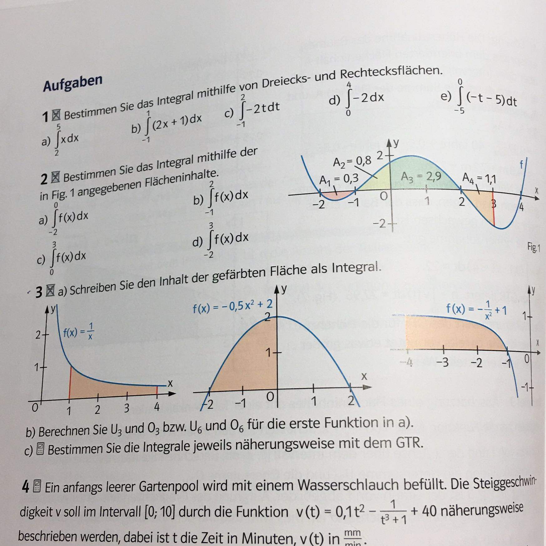0,344093 6 Bestimmen Sie das Integral mittels f(X) = 3x(11)( + 1) 0,37735925 Dreiecks- und Rechtecksflächen 0,41182521a fudx (ae-1fa 50,5dx 0,4472136 U40 Z a 7 Schreiben Sie denInhalt der Flächen Ay U, 2 10,55713553 A, und A3 in Fig. 1 alS Integral una Destmmen U,59464 Sie dafür jeweils einen Näherungswert Fig.2