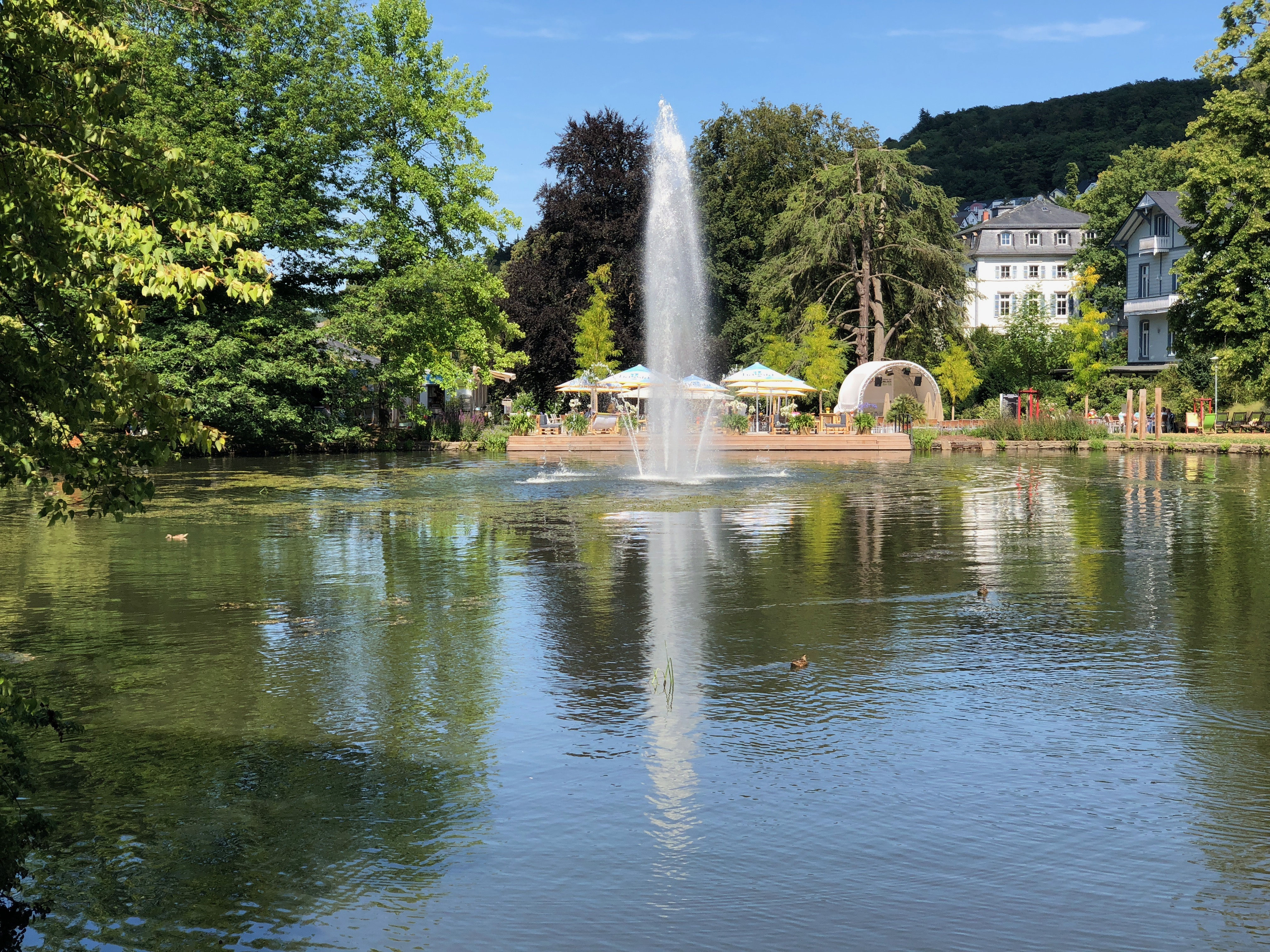Ihr Weg führt Sie zum Kurweiher, der 1850 angelegt wurde. Sehen Sie hier den Enten und Schwänen zu und betrachten das Wasserspiel der Fontaine. Bald wird es hier auch wieder ein gastronomisches Angebot geben! © Stadt Bad Schwalbach. Auf der rechten Seite des Weihers finden Sie einen kleinen Pavillon.