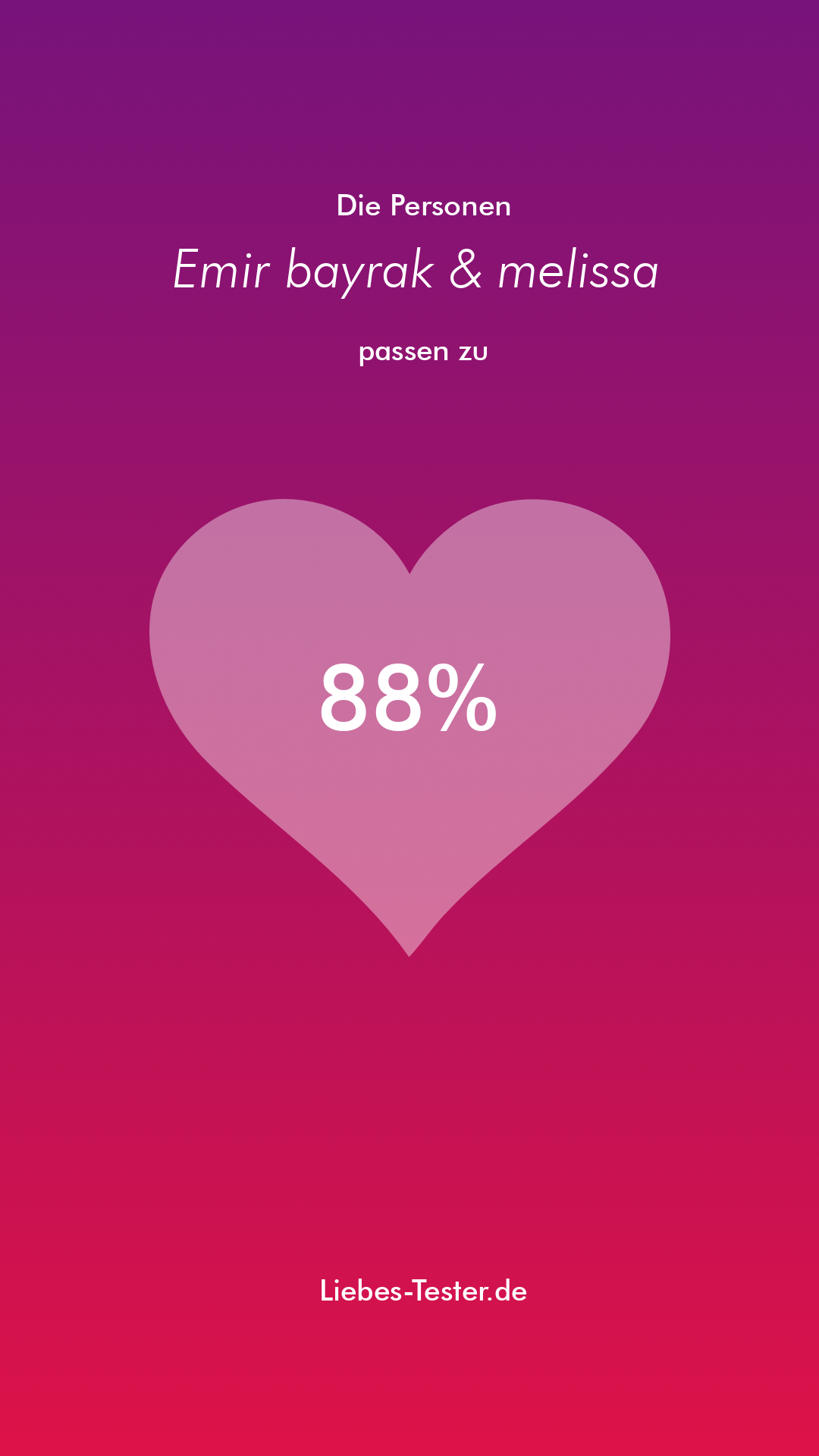 Dein Name. Name Ihres Liebesinteresses. Berechnung. Informationen zum Liebesrechner. Denken Sie daran, sowohl den Vor- als auch den Nachnamen zu schreiben, damit die Berechnung korrekt durchgeführt wird. Der Liebestest berechnet die Wahrscheinlichkeit, dass Ihre Liebe erfolgreich sein wird, als Prozentsatz. Finden Sie unsere Ihre Chancen!