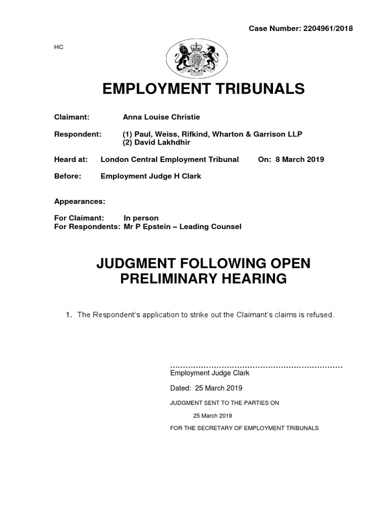 Miss A Christie V Paul Weiss Rifkind Wharton Garrison LLP Others Case 2204961 2018