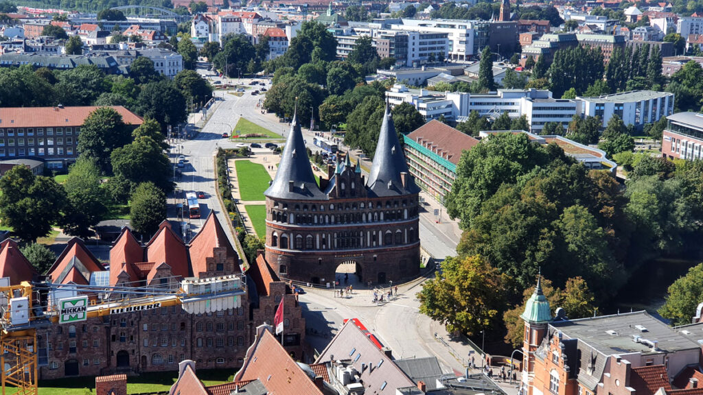 View of Lübeck, Schleswig Holstein, Germany. Its brick Gothic architecture, especially the